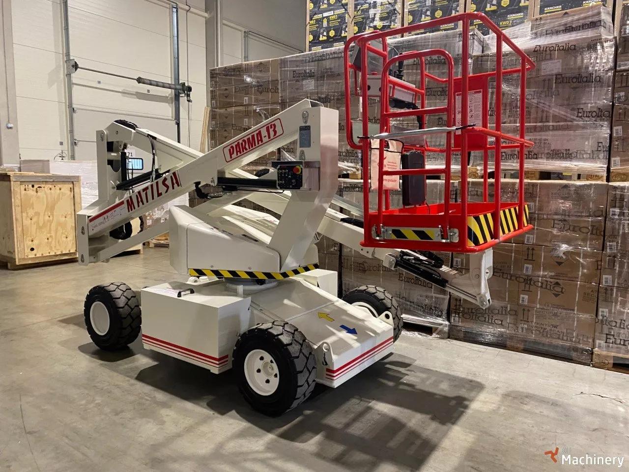 Matilsa Parma 13E alkūninis keltuvas Pagaminimo metai: 2024 Nuosavas svoris: 3520 kg Darbinis aukštis: 13.2 m Šoninis siekis: 6.2 m Keliamoji galia: 225 kg Lopšys: 1.4 x 0.7 m Energijos šaltinis: elektra