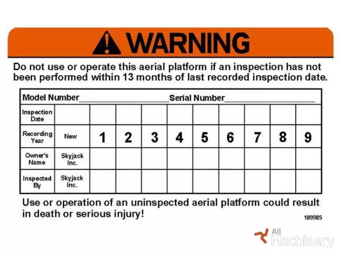 Equipment decals: Make sure the equipment you have on the job is safe. Decals are an inexpensive way to ensure proper and safe operation of the construction equipment. Ensure that decals are legible and in the right place. Clean or replace it if necessary. We have a huge inventory of decals, decals kits for Skyjack including decal Skyjack 109985. Ensure that work equipment is safe.