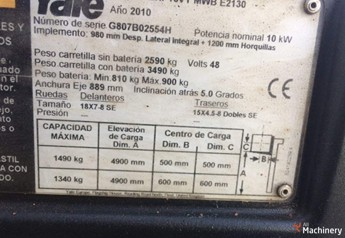 Capacity: 1.600 kg. Year: 2010 Battery: 48V/625AH – (6:15 hours) Charger included 4.900 mm. 3 stages triplex mast Side shift+ 1.200 mm forks Traction hours: 6700 / Pump hours: 7744 WITH OXID, but working well