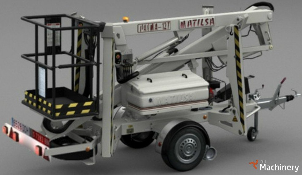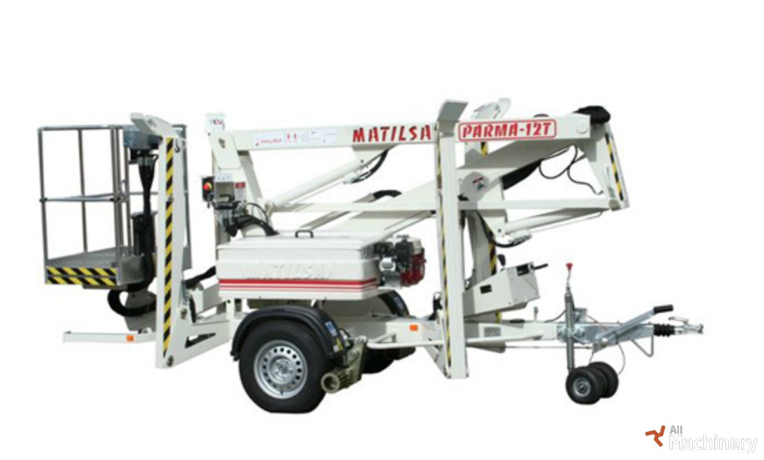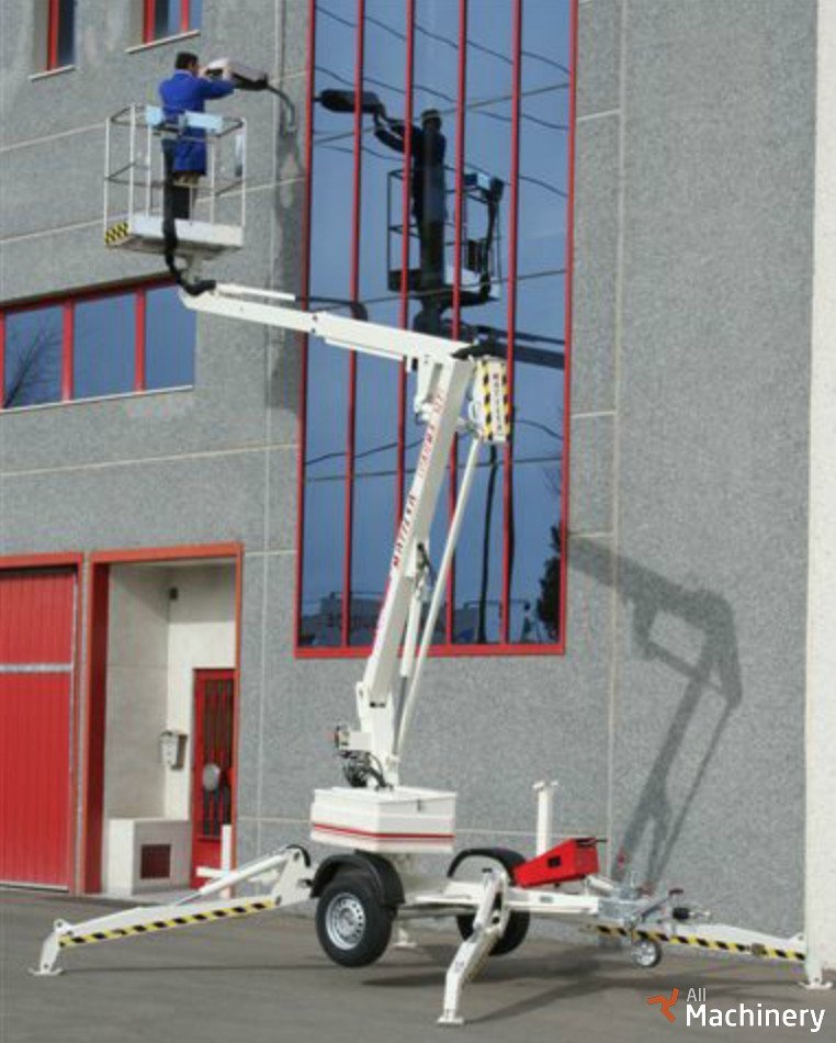 Trailer mounted aerial work platform articulated and telescopic for working heights up to 12 meter (39,37 feet) and t weights 1450kg (3.196 lb). Monophasic 220V, battery or gasoline main powers. Standard version equipped with hydraulic stabilizers.