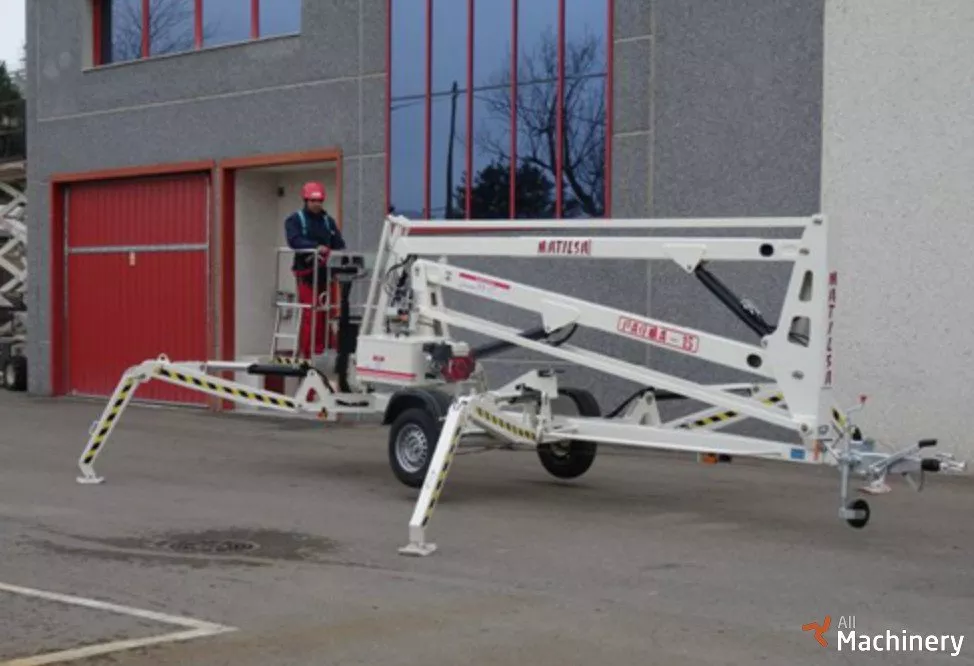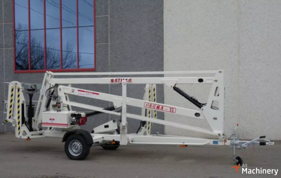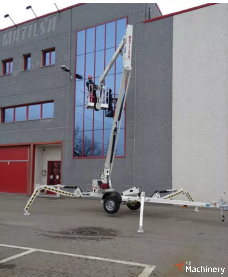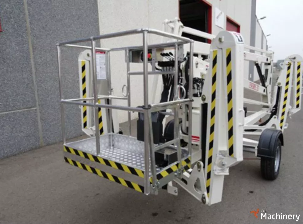 Trailer mounted aerial work platform articulated with 90º jib, for working heights up to 15meter (49,21 feet) and it weights 1.600 kg (3.527 lb). Monophasic 220V, battery or gasoline mains power. Standard version equipped with manual stabilizers