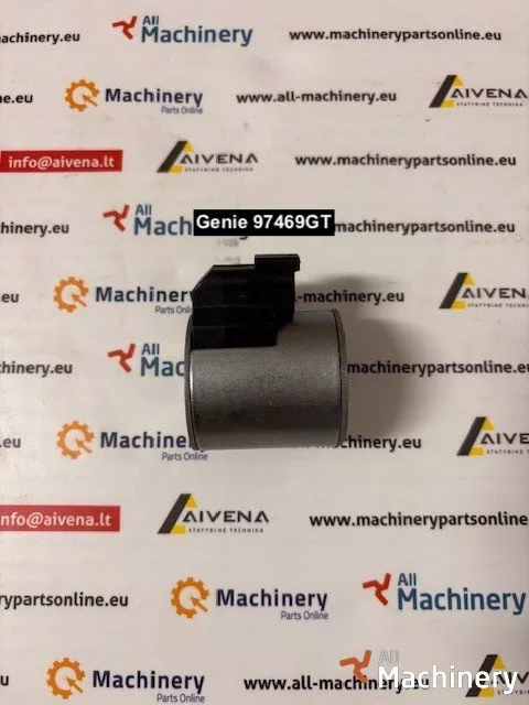 For sale: Genie 97469GT 10V solenoid coil, an OEM replacement coil used in Genie hydraulic valve assemblies. This coil activates solenoid valves to control hydraulic functions such as lift, drive, steering, or boom operation.